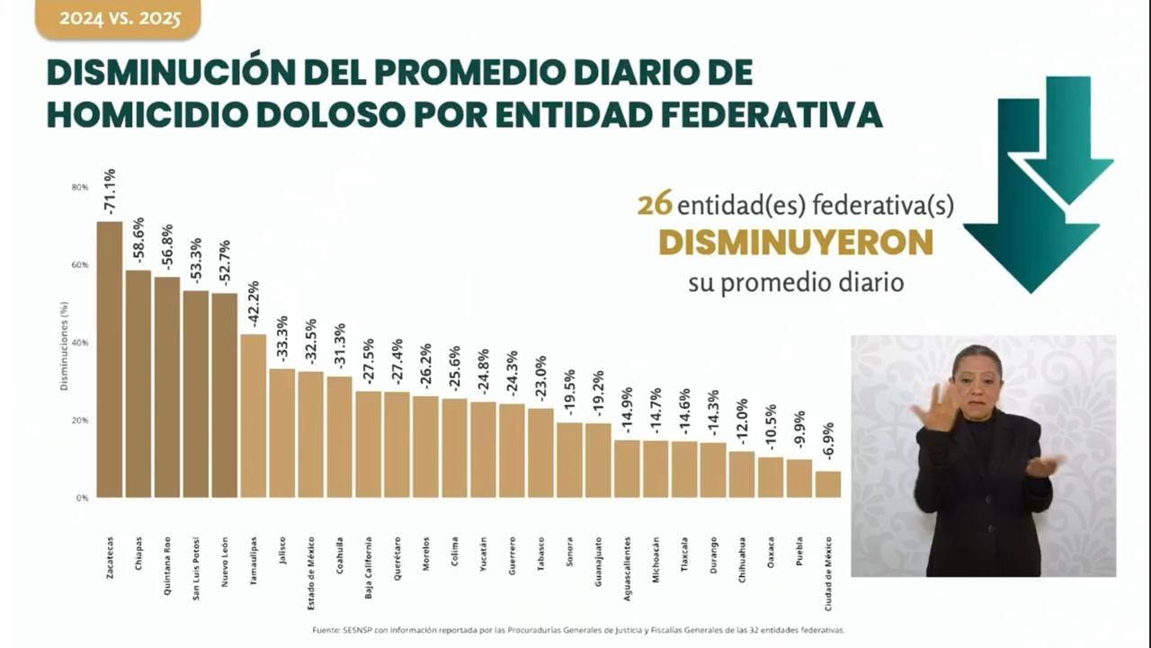Zacatecas se consolida, por segundo año consecutivo, como el estado más seguro de México, al registrar una reducción histórica del 71.1 por ciento en homicidios dolosos entre 2024 y 2025. Así lo informó el gobernador David Monreal Ávila, con base en los datos del Secretariado Ejecutivo del Sistema Nacional de Seguridad Pública (SESNSP), presentados durante la conferencia matutina “La Mañanera del Pueblo”, encabezada por la presidenta de México, Claudia Sheinbaum Pardo.