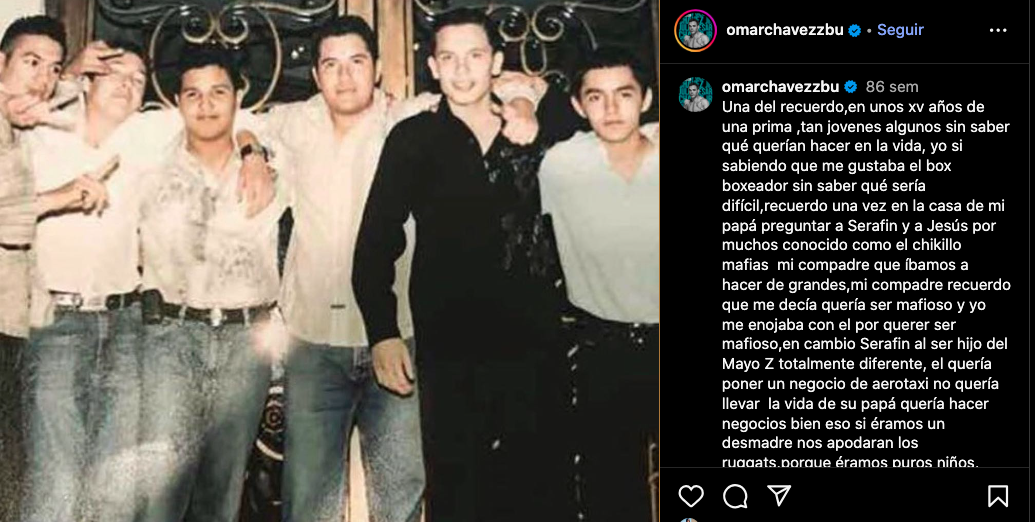 La polémica vuelve a rodear a la familia Chávez luego de que Omar Chávez Carrasco, hijo menor del legendario Julio César Chávez, compartiera en Instagram una foto de hace años junto a Serafín Zambada (el hijo del ‘Mayo’ Zambada) y Jesús Quiñones Flores, alias “El Chiquillo Mafias”, integrante del temido grupo armado “Los Ántrax”. La imagen fue publicada en diciembre de 2023, con un texto que mezcla nostalgia con una sinceridad inquietante: mientras él ya sabía que quería dedicarse al boxeo, su “compadre” decía que quería ser mafioso. “Serafín… quería poner un aerotaxi”, escribió, y remató: “éramos un desmadre” .